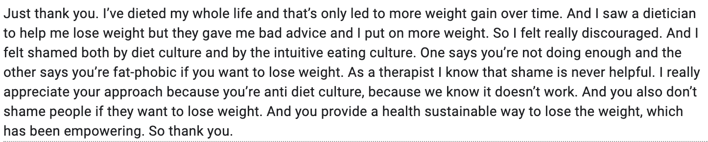 Get access to bonuses workshops like: How to Create Healthy Habits that Stick and How to Calculate Calorie Needs for Weight Loss, as well as a free month in our community, The Sustainable Weight Loss Society.