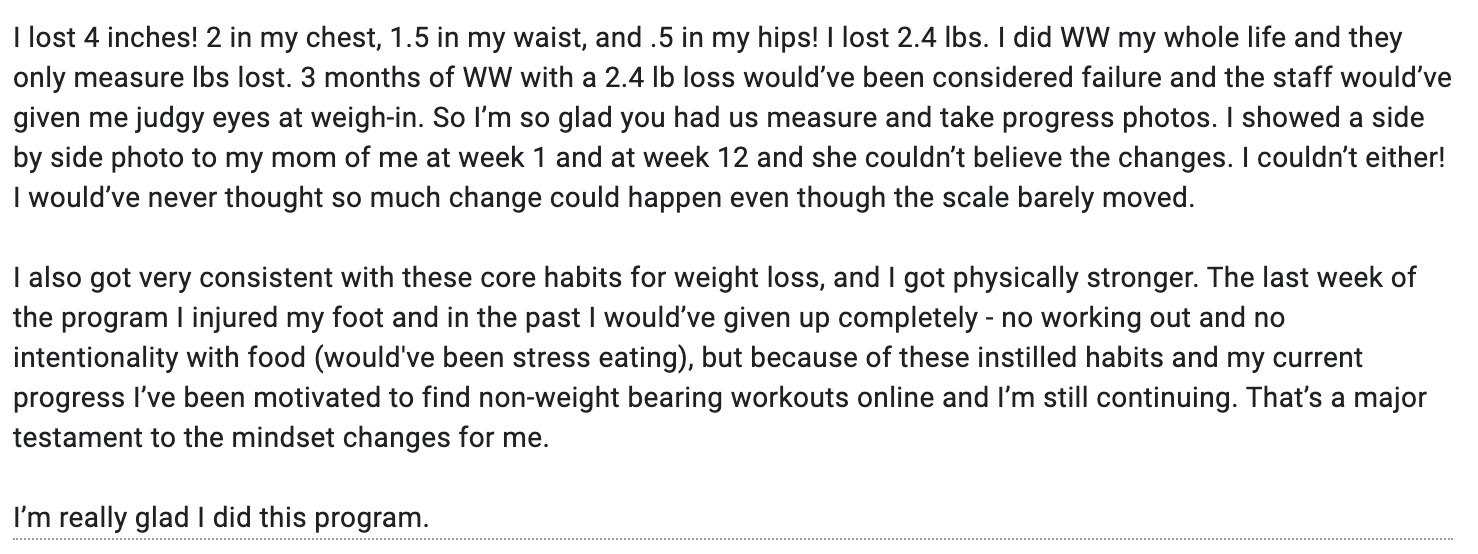 This program is all about sustainable eating and exercise habits. Because if you can't keep up with nutrition and exercise changes long-term, your results won't be long-term either.