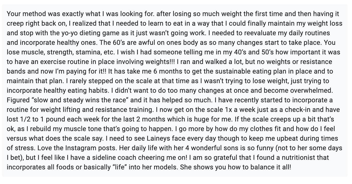 "Before working with Lainey I did not focus well on what I was eating. I also was weighing myself everyday and having that number be the thing that gave me a good day or a bad day.