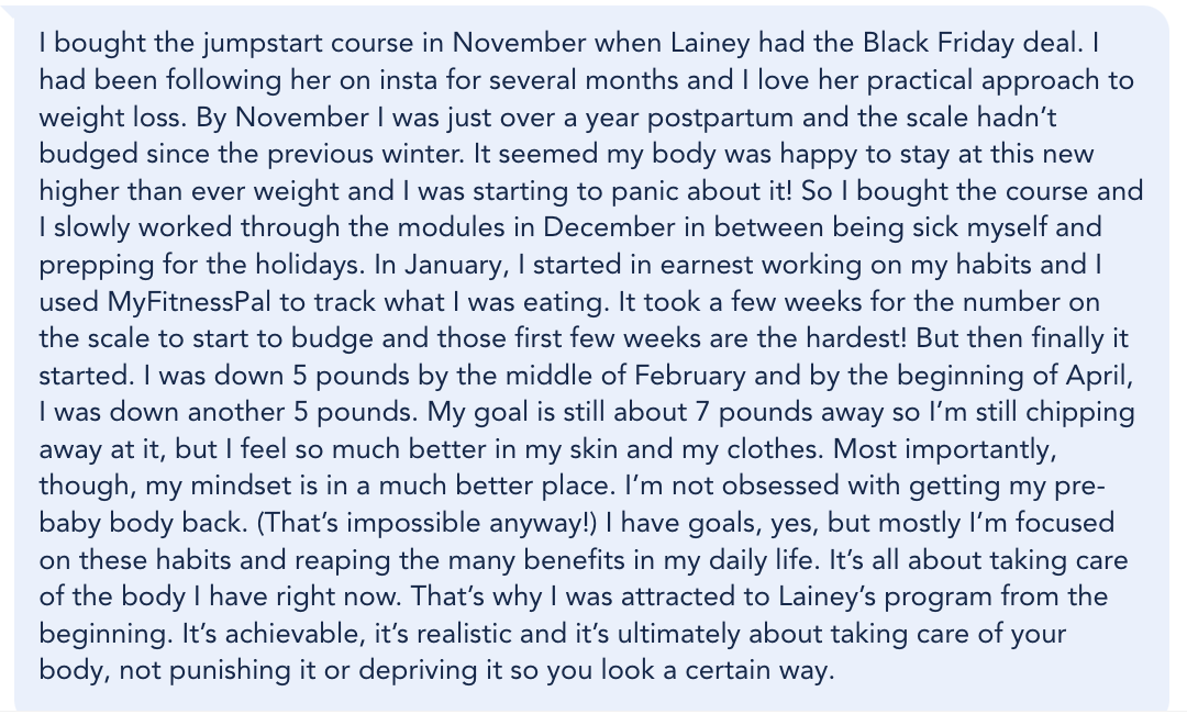 I highly recommend this program if you're looking for real-talk, gentle accountability, and tangible tips you can implement now to gain control and feel better in your body today while sustainably transitioning into a stronger, healthier body tomorrow."