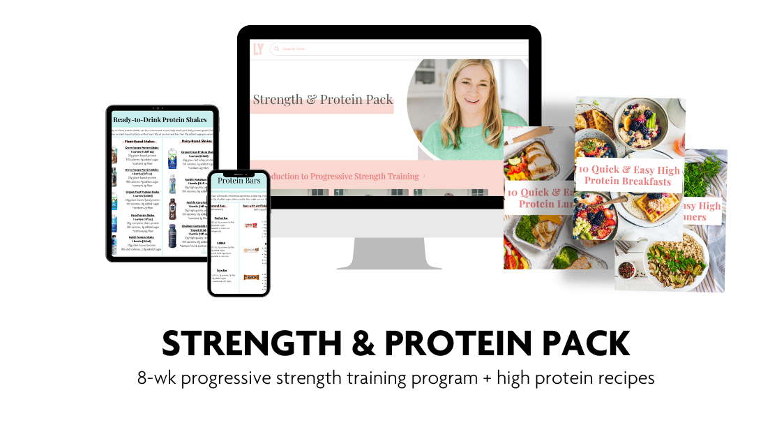 Lifetime access to our go-at-your-own-pace 8-Week Progressive Strength Training Program + our Protein Pack of high protein recipes & foods to set your body up to burn fat.